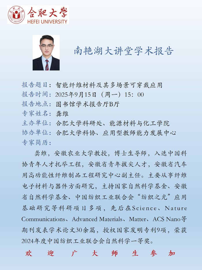 【南艳湖大讲堂】智能纤维材料及其多场景可穿戴应用