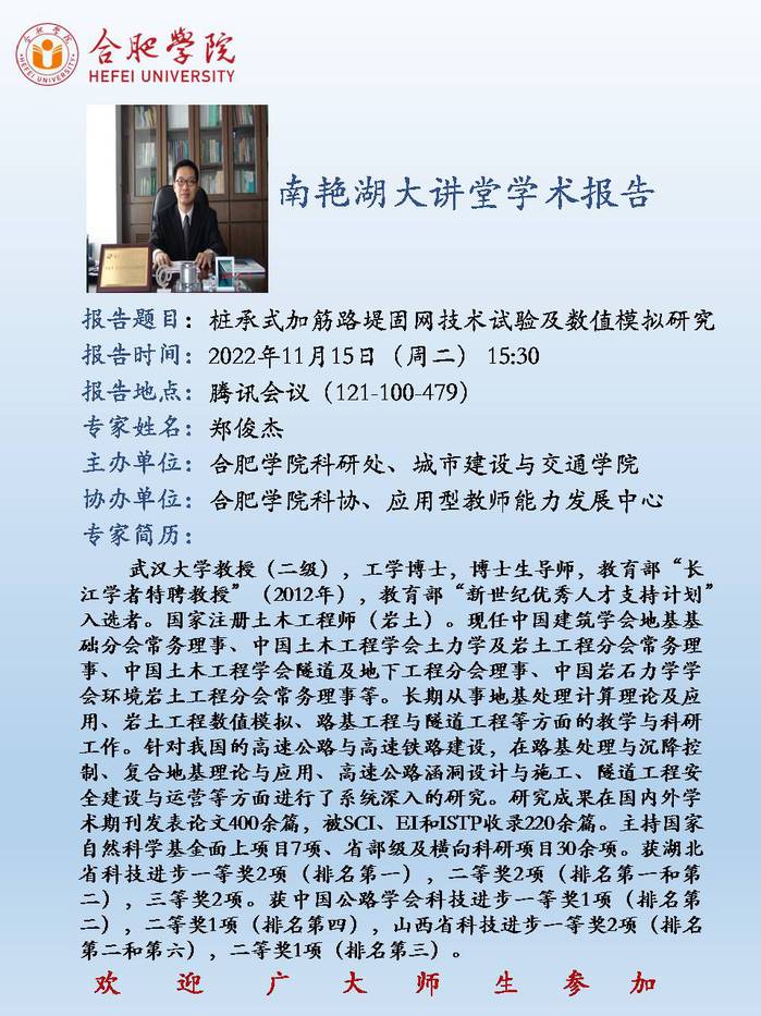 【讲座预告】桩承式加筋路堤固网技术试验及数值模拟研究
