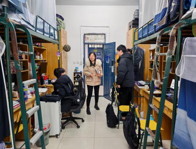 学院党委书记牛欣、院长余海峰、党委副书记姚蓓蓓、副院长陈圣兵、副院长许强等领导班子成员,以及辅导员老师们一同前往新生宿舍区。此次调研旨在倾听学生心声,发现潜在问题,深入推进安全教育和劳动教育,为进一步优化宿舍管理和提升学生生活质量提供有力依据。