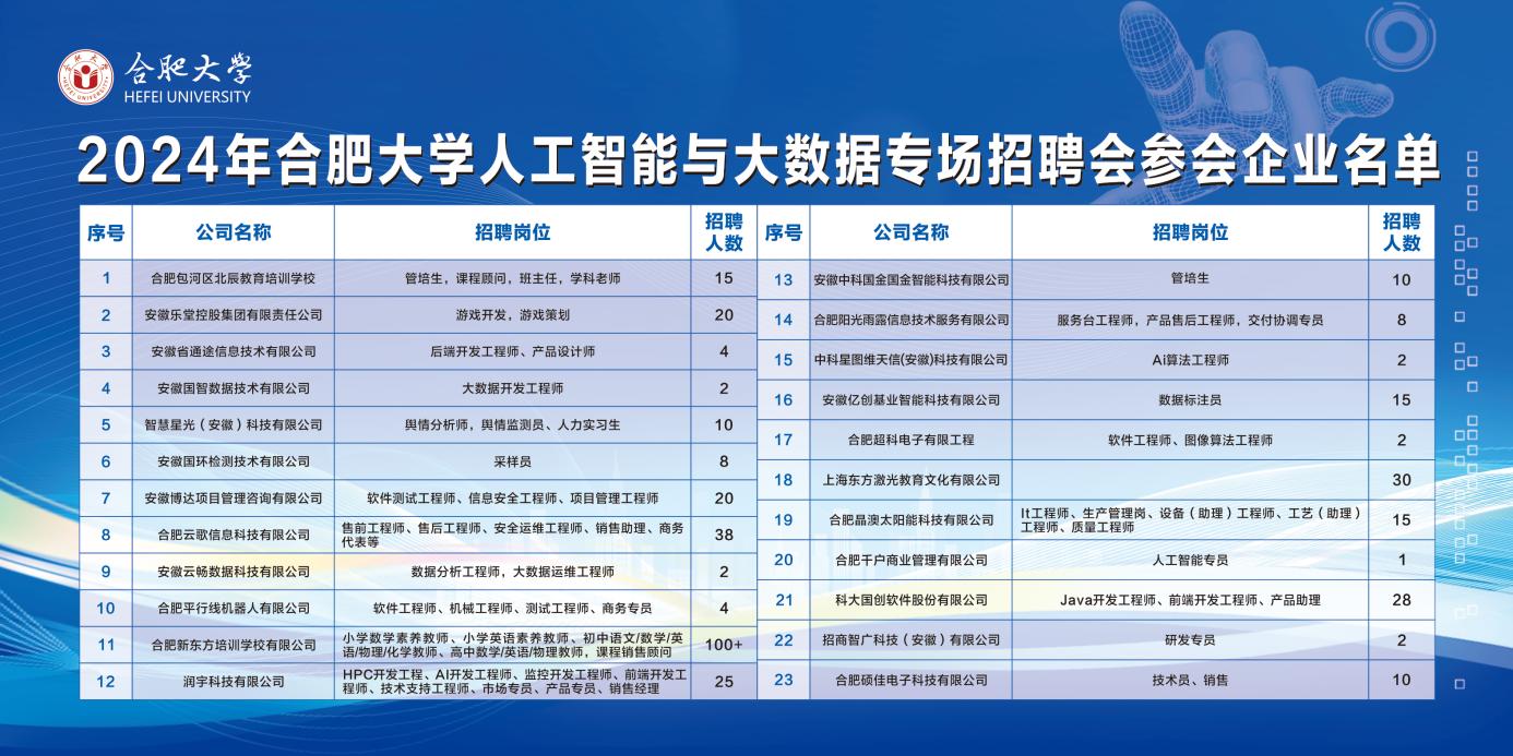 本次招聘会参会单位包含合肥包河区北辰教育培训学校、安徽国智数据技术有限公司、安徽博达项目管理咨询有限公司、安徽乐堂控股集团有限责任公司等23家上市公司、龙头企业、事业单位、研发机构,覆盖后端开发工程师、产品设计师、大数据开发工程师、软件测试工程师、信息安全工程师、项目管理工程师、数据分析工程师,大数据运维工程师等67个优质岗位,271个人才需求,涵盖新能源、新材料、金融、人工智能、大数据技术等多个领域。