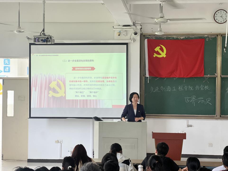 2025年4月28日中午,先进制造工程学院分党校第十期入党积极分子培训班第四次理论授课于38栋3阶梯教室举行,本次党课由马克思主义学院闪茜菁教授进行授课。培训班共114名学员参加了本次课程,本次党课主题是“新时代新征程,答好进一步全面深化改革这道题——学习领悟党的二十届三中全会精神”。