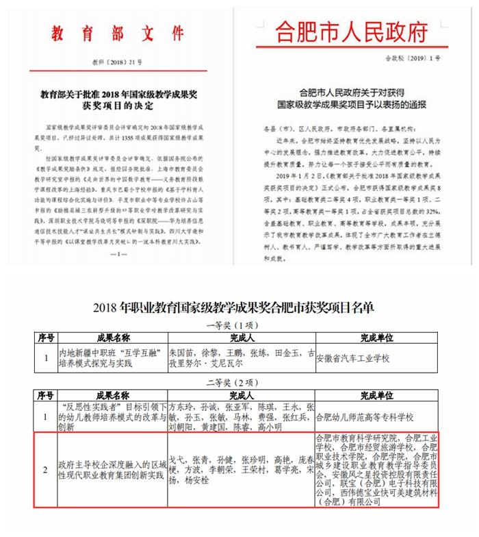 通过加强培训,建立联系,中心架设起校、企沟通交流的桥梁,成为校企合作的纽带,产教融合的推动力量。在2018年中等职业教育教学成果奖评选中,中心与合肥市教育科学研究院、合肥工业学校、西伟德宝业快可美(合肥)建筑材料有限公司等单位紧密合作,联合申报的《政府主导校企深度融入区域性现代职业教育集团创新实践》项目获安徽省特等奖、国家二等奖,还有多个联合申报的项目获得省级二等奖等奖项。下一步,中心还将致力于合肥市现代职业教育集团产学研联盟的建设,进一步密切集团内各类学校、企业、行业协会的联系,深入开展技术和产品研发、课程标准和人才培养方案制定、技能培训、成果转移转化、技术服务等方面的服务,在生产、育人、研究等方面取得跟多的成果。