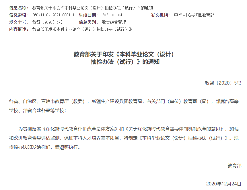 第七条 教育部建立全国本科毕业论文抽检信息平台(以下简称抽检信息平台),面向省级教育行政部门提供学术不端行为检测、毕业论文提取和专家评审等定制功能,对各省级教育行政部门开展本科毕业论文抽检工作实行全过程监督。