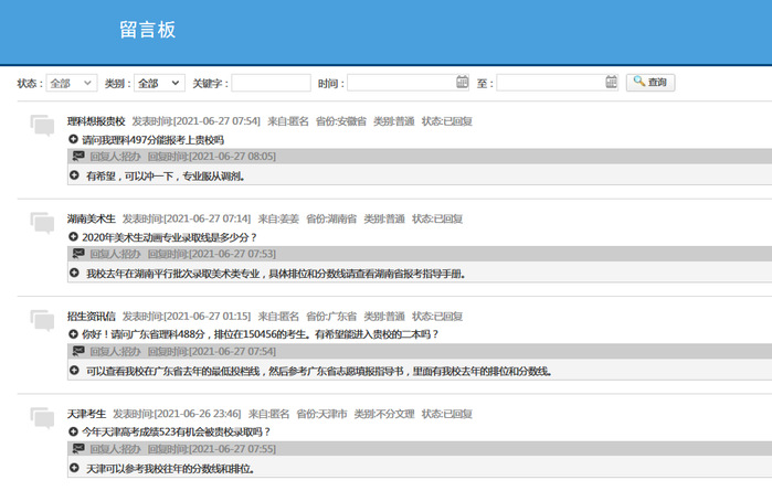 学校招生信息网及时更新各板块内容,让考生既可轻松快捷地了解到学校的基本概况、校园生活、特色品牌专业,又可方便查询到学校历年来录取分数线等信息,此外,网站通过在线留言板同步接受考生咨询。同时,各二级学院的网站也及时进行了信息更新。
