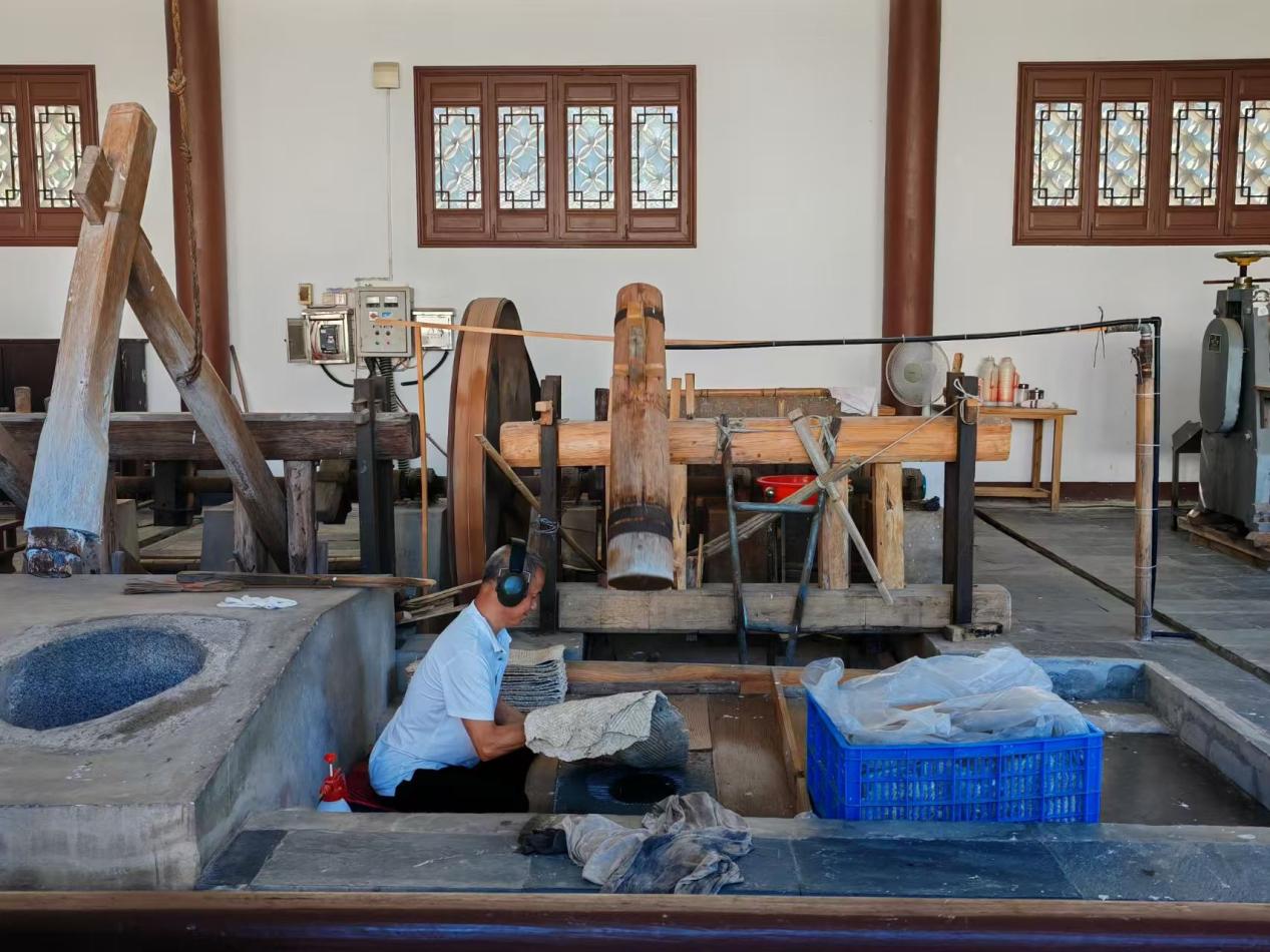 而在古法造纸体验区,团队成员们切实的看到匠人们是如何将一张宣纸制成。在“捞纸”技艺展区时,成员们看到匠人们手持竹帘浸入纸浆池,轻轻晃动、均匀捞起,再经压水、揭纸等环节,一张薄如蝉翼的湿纸坯逐渐成形,不禁感叹宣纸这项非遗文化的魅力与技艺的精细。此外,团队还参观了宣纸晒纸的方式。数张湿纸整齐排列在木架上,阳光透过纸张投射出斑驳光影,匠人手持长杆翻纸、调整角度,确保纸张均匀干燥。