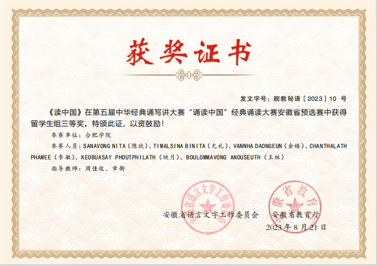 近日,由教育部、国家语委主办的第五届中华经典诵写讲大赛“诵读中国”经典诵读大赛已完成全部赛程,由我院教师周佳俊、章衡指导,尤礼(TIMALSINA BINITA)、陈欣(SANAVONG NITA)、金皓(VANNHA DAONGEUN)、李敏(CHANTHALATH PHAMEE)、映月(KEOBUASAY PHOUTPHILATH)、王林(BOULOMMAVONG ANOUSEUTH)六位留学生(均为我院留学生)共同诵读的作品《读中国》荣获安徽省三等奖及全国优秀奖;由我院教师王昌宜、汤尧老师指导,陈长苏(YOEURN PHANET)、巴丽娜(KHOUNTHALIVONG PAVINA)两位留学生共同诵读的作品《我的南方和北方》荣获安徽省优秀奖。