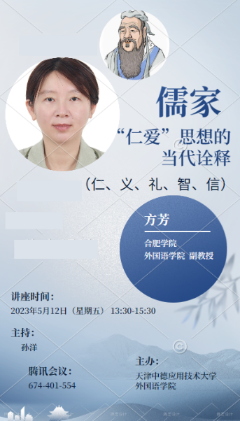 2023年5月12日下午,应天津中德应用技术大学外国语学院的邀请,合肥学院外国语学院方芳副教授做题为“儒家‘仁爱’思想的当代诠释”讲座。以儒家文化的“仁爱”思想为切入点,讲座从以下几个方面展开:一、儒学核心价值——“仁义礼智信”;二、“仁”的内涵及发展;三、“仁义礼智信”的五行解读;四、“仁爱”思想的当代解读;五、“仁爱”思想与人生幸福;六、如何实践“仁”。
